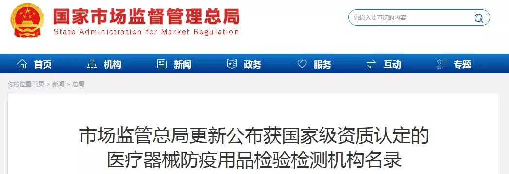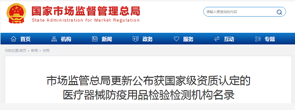 市场监督总局更新公布获国家级资质认定的医疗器械防疫用品检验检测机构名录